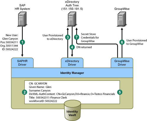 Figure 4-5 shows a typical, yet simple, scenario involving the provisioning of the Single Sign-On credentials for a new user in GroupWise®. This department provisions new users into the Identity Vault via a SAP HR system and Identity Manager. Depending on organizational information, the user is then provisioned into a department authentication tree implemented on eDirectory. This is where new users authenticate to the network, and is also the repository of GroupWise security credentials that Novell iChain® or Access Manager® utilizes to provide secure Single Sign-On functionality from outside the company firewall. As users are subsequently provisioned by Identity Manager to GroupWise, the credentials for those systems are synchronized to their SecretStore attributes in the authentication tree.