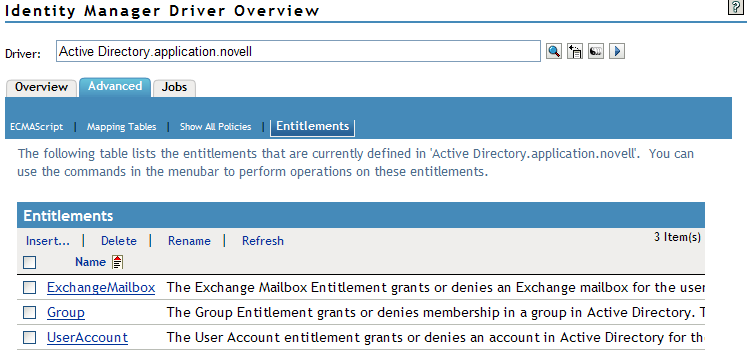 Figure 6-1 Entitlements That Come with the Active Directory Driver