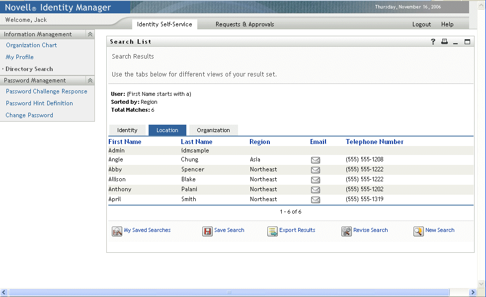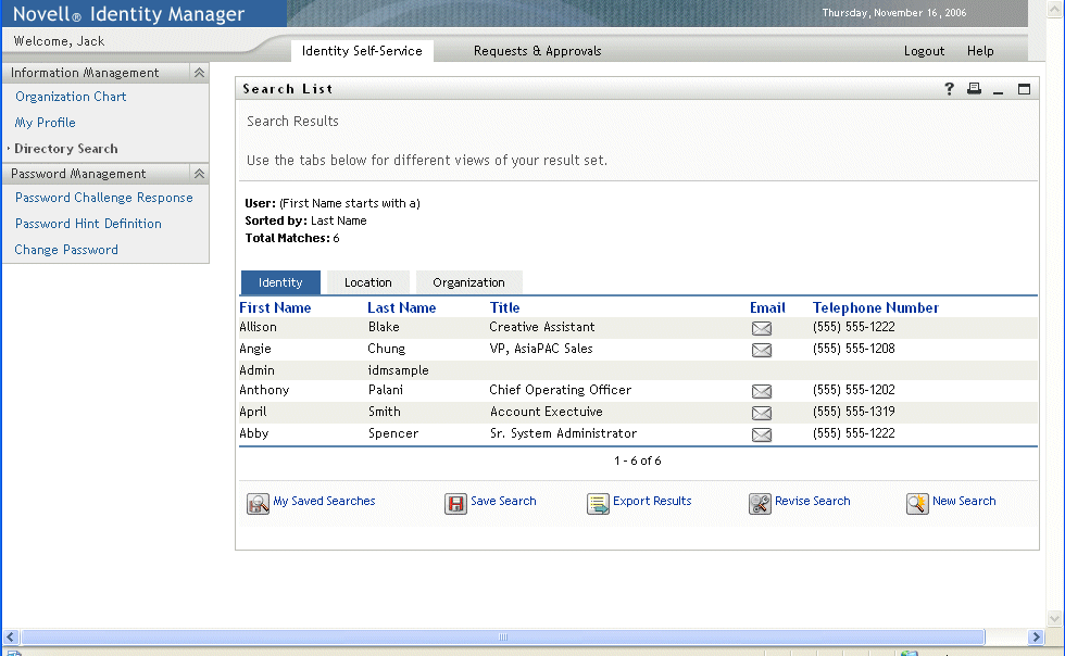 The Search List portlet allows users to search and display the contents of the Identity Vault. It is the basis for the Directory Search action of the Identity Manager User Application tab. The Directory Search action is configured to allow users to search for users and groups, but you can modify it to change the scope of searchable objects and attributes.