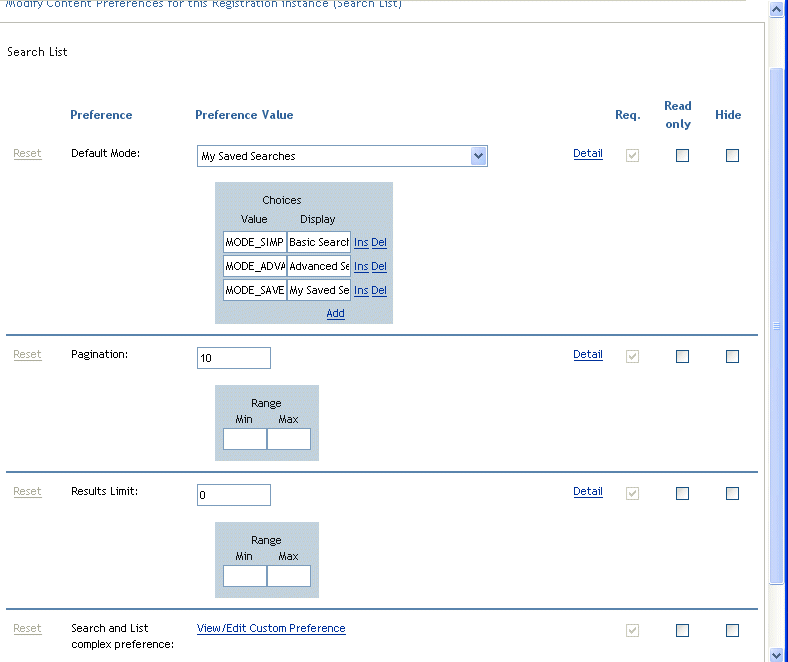 Preferences for the search list portlet let you define: