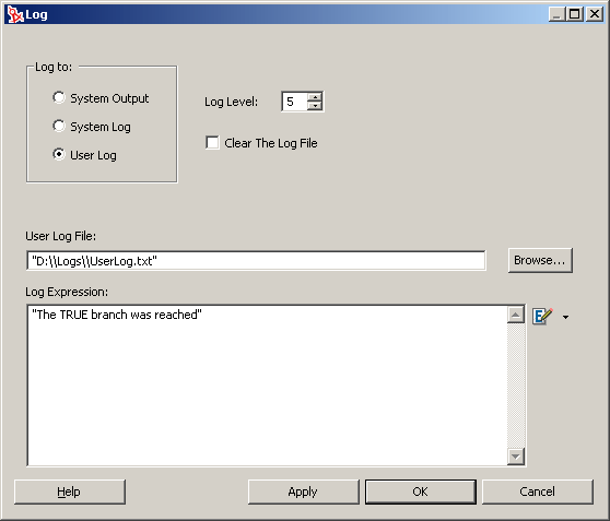 The Log action writes information to locations specified in the action. There are three locations for log output: System Output, System Log, and User Log.