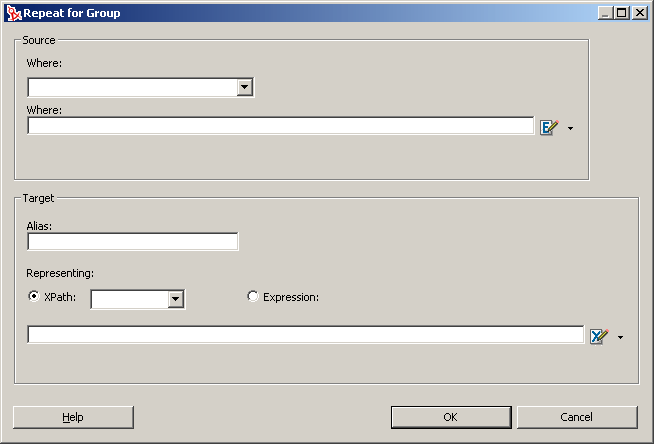 Similar to the Repeat for Element action, a Repeat for Group action also uses the concept of an alias. The values for the source group used in the Repeat for Group dialog boxes are the list names created by the Declare Group action. The list names perform two functions. They are an alternate name or shorthand for the XPath source of any Map actions within the loop. This saves you the work of re-specifying long XPath expressions. The group list name, when used in place of a DOM name in a Map action source, is also an indicator to the Map action within the Repeat loop to use the next instance in the group list each time the loop processes. A Map action within a Repeat for Group loop that does not use the group name always refers to the first instance of the element in the source part.