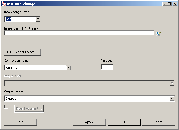 When using the GET interchange, fill in the field with a URL that points to the XML document that you want to bring into the Integration activity. In the field, you select the DOM (Input, Output, _SystemFault, or Project) that is to receive the XML.