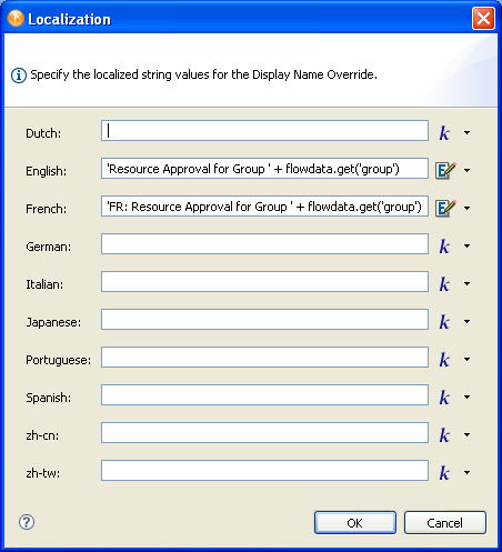 Allows you to override the provisioning request definition’s display name. This is the name that displays in the column when the user selects or . The name can be a constant or the result of an ECMA expression, and it can be localized for each supported locale. To access the dialog boxes that let you specify the constant or ECMA expression, the button in the column.