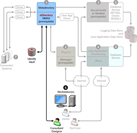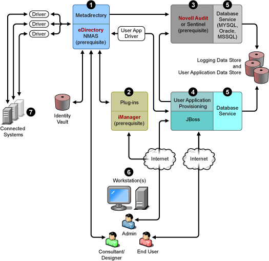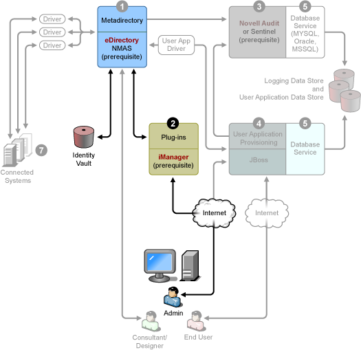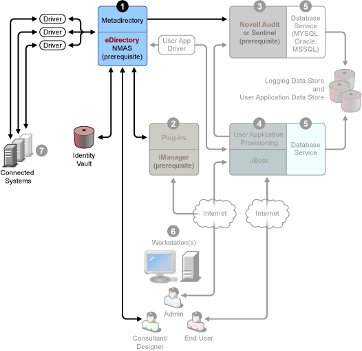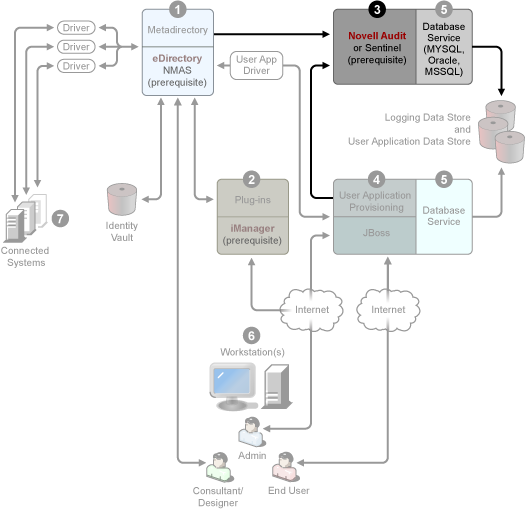 NOTE:Before installing Identity Manager components, you need to first install prerequisite software including eDirectory 8.7.3.6 or later (for the services shown in numbers 1 and 3 in the graph above), Security Services 2.0.4 with NMAS™ 3.1.3 (for numbers 1 and 3), iManager 2.6 or later (for number 2), and Novell Audit 2.0.2 Starter Pack or Novell® Sentinel™ 5.1.3 (for number 3). You can get the prerequisite software from the Novell Download Web site. For a detailed list of prerequisites and requirements, see Section 1.5, System Requirements for Identity Manager.
