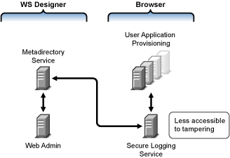 Figure 1-3 illustrates one possible deployment strategy, with one server for the Metadirectory service, one server for the Web-based administration service, one server for the secure logging service, and one server for User Application and Provisioning services.
