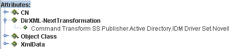 Each attribute contains the DN of the policy or the style sheet the Policy Set is referring to. If there are multiple policies in a Policy Set, then a chain of policies is created. The DirXML-NextRule attribute points to the next policy in the Policy Set that needs to be executed. Figure 2-2 shows a Command Transformation style sheet, including the next Command Transformation style sheet or policy that is executed in the DirXML-NextTransformation attribute.
