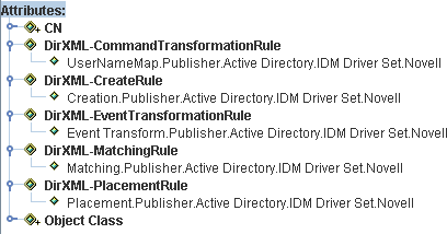 The previous architecture used a separate eDirectory™ attribute to represent each Policy Set on the driver, the Publisher object, or the Subscriber object that pointed to an individual policy (rule or style sheet) object. The driver object stored the Input Transformation, Output Transformation, and the Schema Mapping policy sets. The Publisher and Subscriber objects stored Event Transformation, Matching, Create, Placement, and Command Transformation Policy Sets.