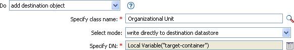 Creates an object of the specified type in the destination data store, with the name and location specified in the field. Any attribute values to be added as part of the object creation must be done in subsequent Add Destination Attribute Value actions using the same DN.