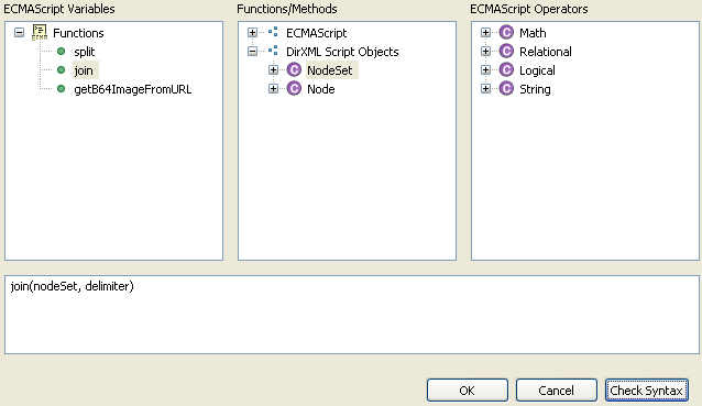 In the following example, the join ECMAScript variable is used with the NodeSet function or method, but there is no ECMAScript operator selected.