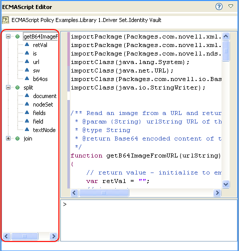 As functions and variables are defined in the ECMAScript, they are displayed on the left side of the ECMAScript editor.