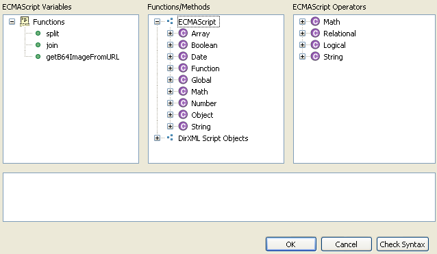 lists all of the current defined functions in the ECMAScript. contains the standard ECMAScript functions and the DirXML Script functions. displays the standard ECMAScript operators.