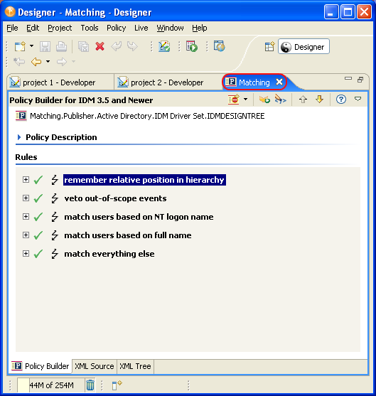 Designer contains two policy builder, the pre-Identity Manager 3.5 Policy Builder and the Identity Manager 3.5 and Later Policy Builder. The Policy Builder version is determined by the version of Identity Manager. To set the version of Identity Manager: