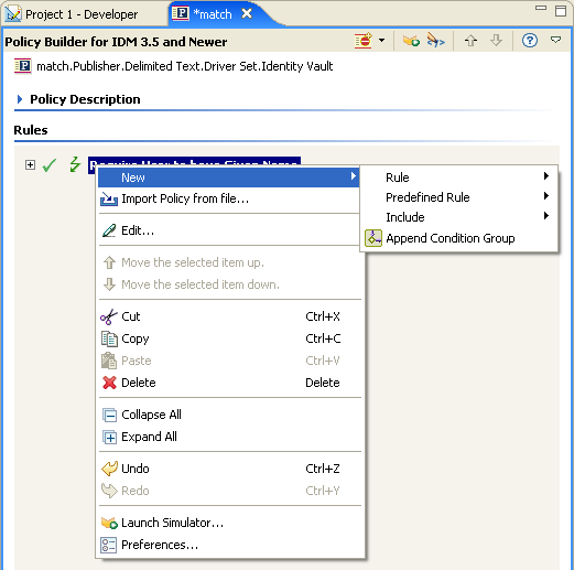 Figure 3-4 Policy Builder Context Menu and Toolbar