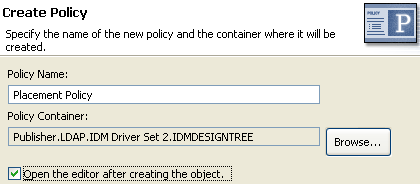 A file conflict window appears with the message “ Before editing this item you need to save. Do you wish to save the editor’s changes and continue?” Click . The Policy Builder is launched and the new Placement policy is saved.