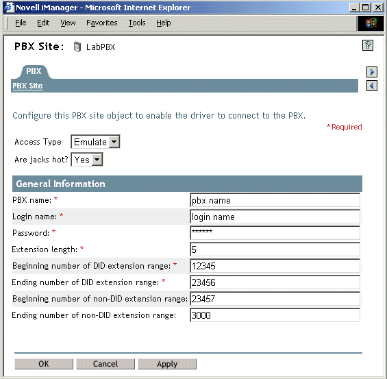 An iManager plug-in is provided to help you set up these sites. In iManager, select . The following figure shows an example of the interface for setting up a PBX site.