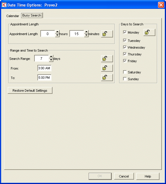 This setting is used only when the user does a busy search through the Busy Search option on the Tools menu. Otherwise, the default appointment length defined on the Calendar tab is used (see Section 6.4.15, Date and Time > Calendar).