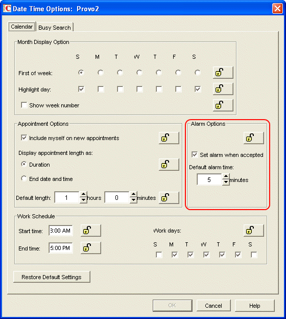 Figure 6-20 Date and Time Options with the Alarm Options Highlighted