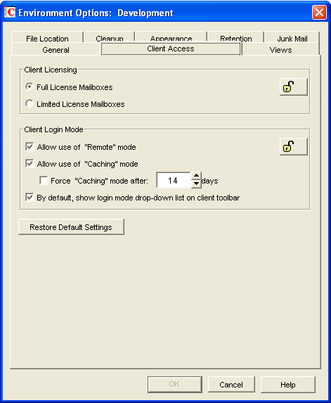 Figure 6-8 Environment Options Dialog Box with the Client Access Tab Open