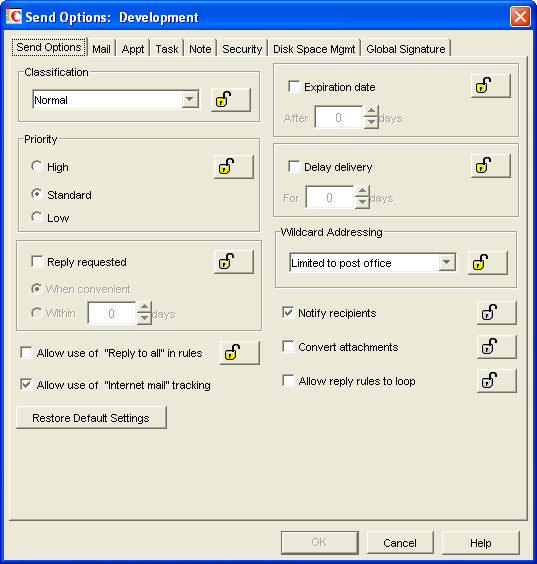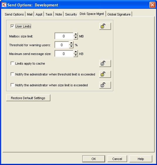 Figure 6-18 Send Options Dialog Box with the Disk Space Mgmt Tab Open