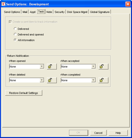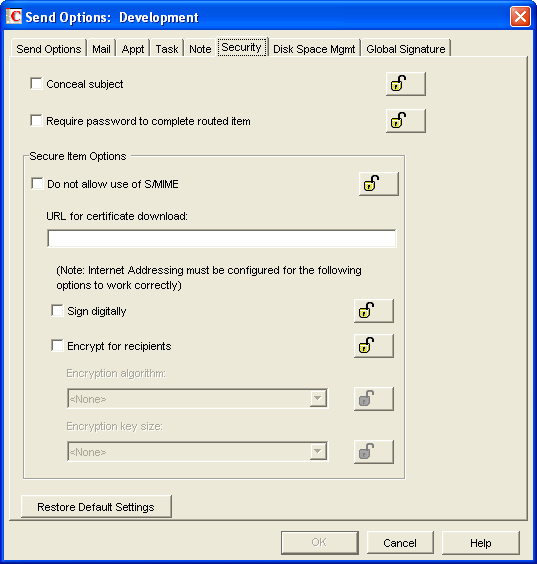 The security settings are found in ConsoleOne through the GroupWise client options under . Security options apply to all GroupWise items types (mail messages, appointments, tasks, and notes).