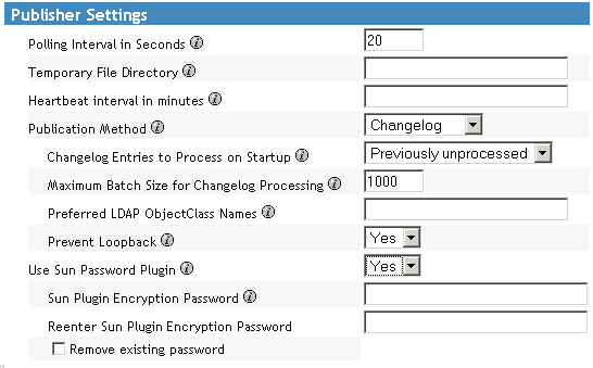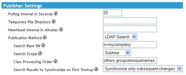 Some settings apply to both the changelog and LDAP-search publication methods. Some settings apply only to the changelog publication method. Other settings apply only to the LDAP-search publication method.