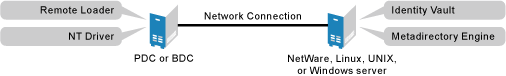 As shown in Figure 2-4, Installation Configuration: Remote Loader and NT Driver on the PDC or BDC, you can install the Remote Loader and the NT driver on the PDC or the BDC, but install the Identity Vault and the Metadirectory engine on a separate server.