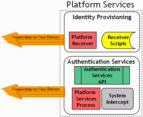 The Platform Services Process makes requests to core drivers for Authentication Services functions such as authentication, user name resolution, and password changes.