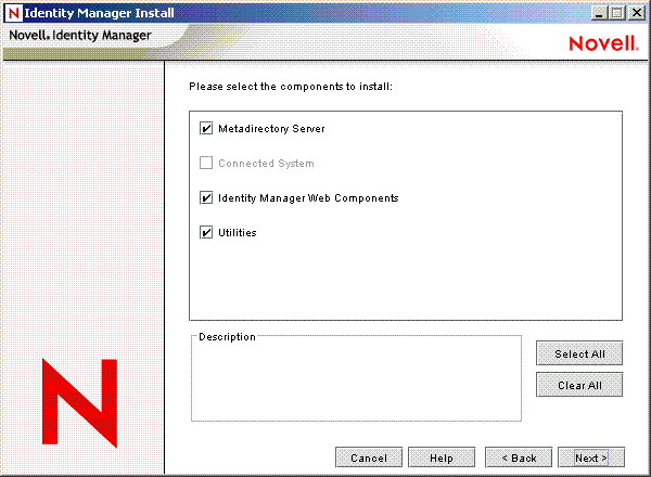 Select the Metadirectory Server or Identity Manager Connected System option. See Section 2.4, Installing the SAP HR Driver. Select the Identity Manager Web Components option. See Section 2.5, Installing Driver Configuration Import Files. |