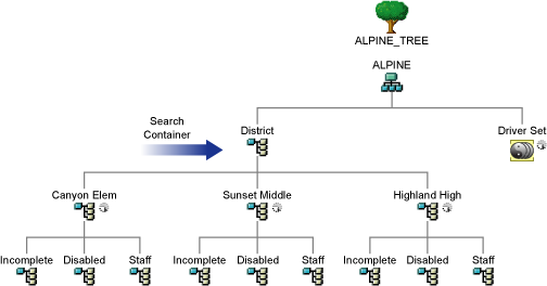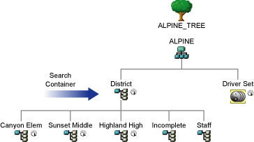 For this example, the District container is the search container. The search container should be high enough in the tree to include all students and staff.