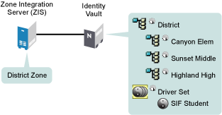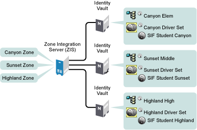 In this example there are three Zones, one per school. Identity Manager and the Identity Manager Driver for SIF are installed on a server that holds replicas of the partitions from each school. One driver is configured to connect to all three Zones.