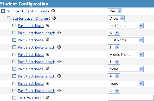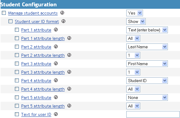 The driver configuration gives you a lot of flexibility in specifying the pattern for creating User IDs. You specify one pattern for student User IDs and a separate pattern for creating staff User IDs. You can create User IDs that are a combination of up to 5 parts.