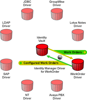 The purpose of the Identity Manager WorkOrder driver is to allow work to be scheduled. The driver uses information from the work order container to see which WorkOrder objects are pending and due. Work orders that are pending and due are processed by the driver. The definition of the work to do is contained in the work order. For example, the work to do can be modifying an object attribute in the Identity Vault or sending an e-mail to the administrator. Policies in the WorkOrder driver perform the work that is defined in the work order.