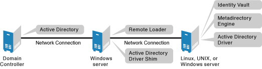 The Active Directory driver shim must run on one of the supported Windows platforms. However, you don’t need to install the Metadirectory engine on this same machine. Using a Remote Loader, you can separate the engine and the driver shim, allowing you to balance the load on different machines or accommodate corporate directives.