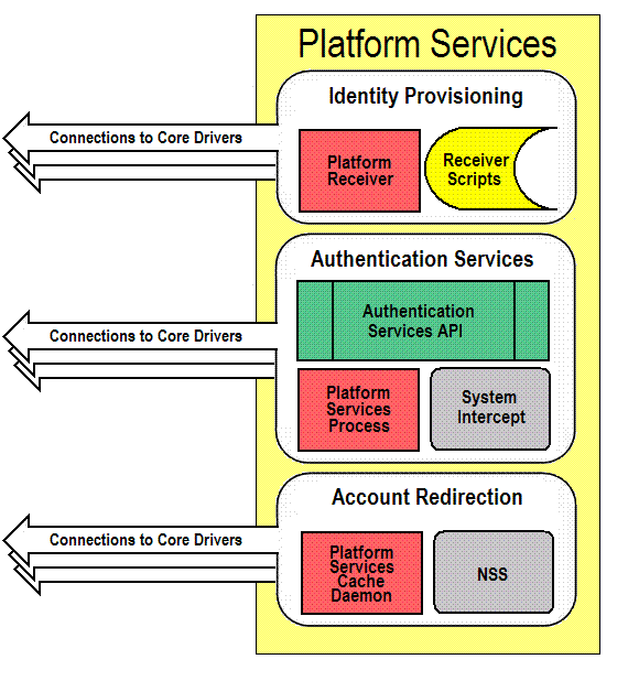 Platform Services enables a system to utilize the Core Driver functions. A platform can use Authentication Services for some or all users, and can use Identity Provisioning in maintaining some or all local user accounts and groups. For a complete account redirection solution, a platform can use the Name Service Switch and Platform Services Cache Daemon for some or all users.