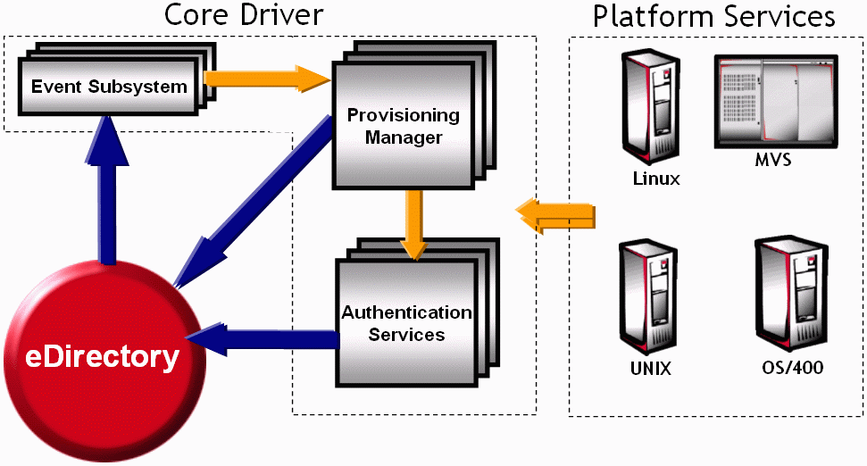 The driver obtains and stores the information it uses in an eDirectory™-based “Identity Vault.” To access the Identity Vault, the Core Driver uses LDAP Services for eDirectory.