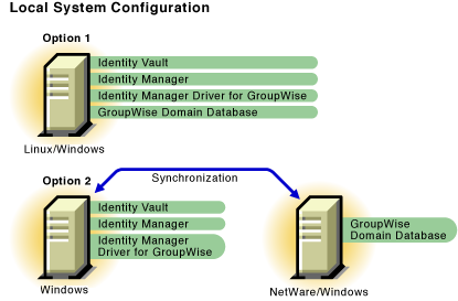 In a local installation, the GroupWise driver is on the same server as the Metadirectory engine and Identity Vault. The GroupWise domain database can be on the same Windows/Linux server (Option 1), or it can be on a different Windows/NetWare server (Option 2).