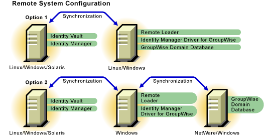 IMPORTANT:When the driver is installed on a Windows server and the GroupWise domain database resides on a remote Windows/NetWare server (Option 2 in Figure 2-1), you must install the Novell Client™ 4.9 or later on the driver’s server.