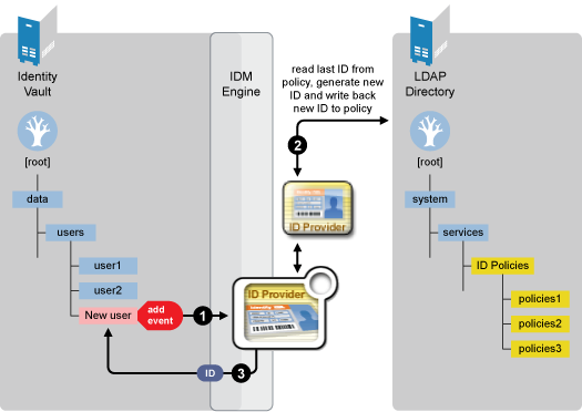 The ID Provider driver reads the last ID that was generated from the ID Provider polices in the Identity Vault and generates a new ID. The ID is then written back to the ID Provider policies in the Identity Vault to track the unique IDs.