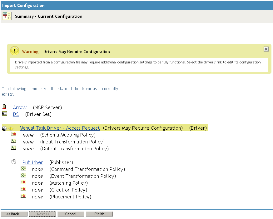 At this point, the driver is created from the basic configuration file. To ensure that the driver works the way you want it to for your environment, you must review and modify (if necessary) the driver’s default configuration settings.