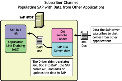 The Subscriber channel receives XML-formatted Identity Vault events from the Metadirectory engine. The driver then converts these documents to an appropriate data format, and updates SAP via the BAPI interface.