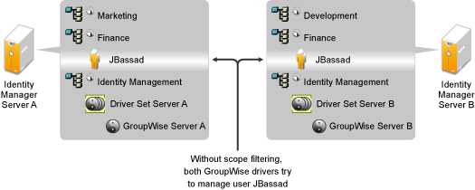 Because Server A and Server B both hold a replica of the Finance container, both servers hold the user JBassad, who is in the Finance container. Without scope filtering, both GroupWise Driver A and GroupWise Driver B would synchronize JBassad.