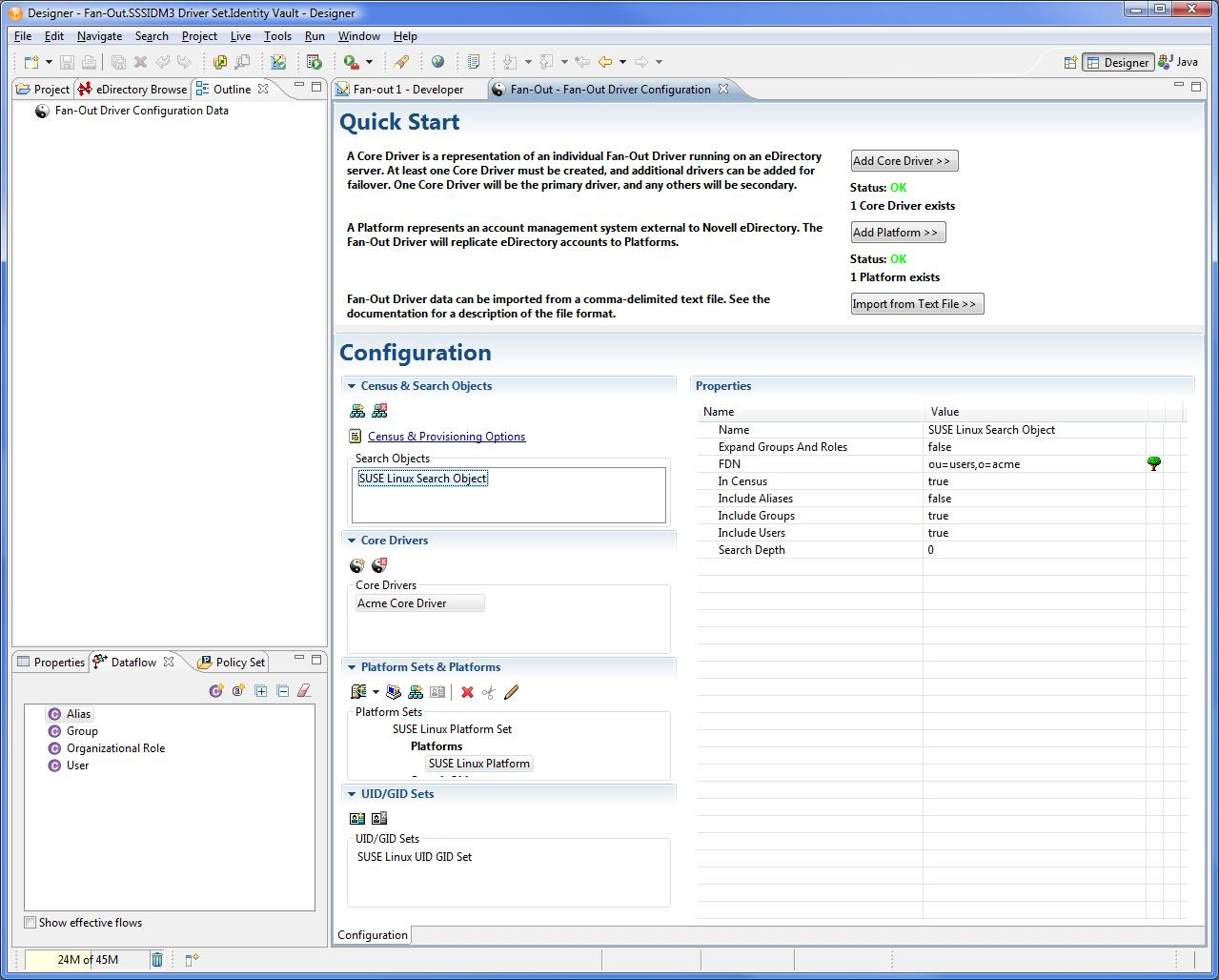Novell Designer is a graphical user interface tool that allows you to model and deploy Identity Manager installations. Designer includes a Fan-Out Driver plug-in that enables you to configure Fan-Out data (such as Search Objects, Platforms, and Platform Sets) before deploying the Driver to eDirectory. With Designer you can also perform mass imports much more efficiently than with iManager.