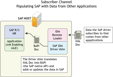 The Subscriber channel receives XML-formatted Identity Vault events from the Metadirectory engine. The driver then converts these documents to an appropriate data format, and updates SAP via the BAPI interface.