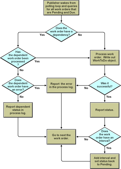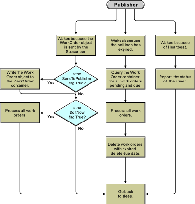 The Publisher channel wakes when the polling time has expired and queries the work order container for work orders that are pending and due. The driver processes these work orders. Work orders with delete due dates are deleted.