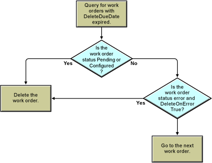 The Publisher channel now queries the work order container for work orders with an expired DeleteDueDate attribute. If the status of the work order is Pending or Configured, and the DeleteDueDate has expired, the work order is deleted. The work order is also deleted if it has an error status and the DeleteOnError attribute is set to True. The following flowchart illustrates this process.