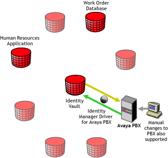 The Identity Manager Driver for Avaya PBX communicates with the PBX and carries out work orders by logging in just as a PBX administrator would. The driver uses information from the Identity Vault as well as customizable settings and policies to configure the extension correctly. After configuration is completed, the driver publishes the new phone number to the Identity Vault, and the phone can be delivered and physically installed.