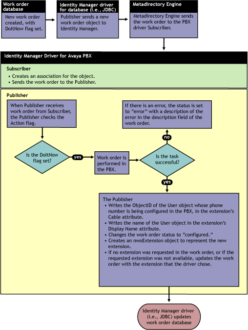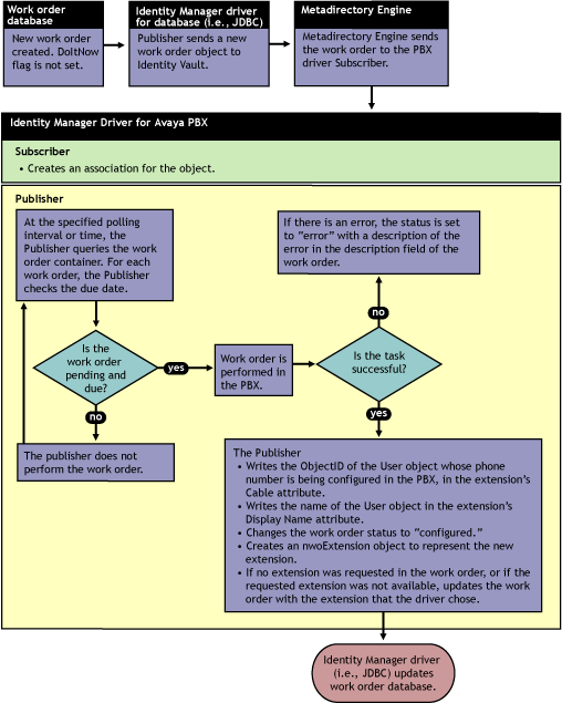 The Identity Manager Driver for Avaya PBX performs the work orders and the results are returned to Identity Vault. The JDBC driver then updates the work order database with the results. This allows the person who entered the work order to check on the status in the work order database.
