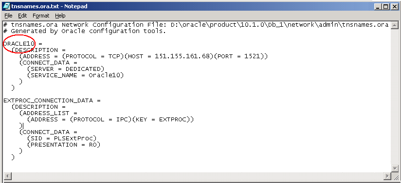 An example URL syntax is jdbc:oracle:oci8:@ORACLE10. In this example, ORACLE10 is the connection string in the tnsnames.ora file.