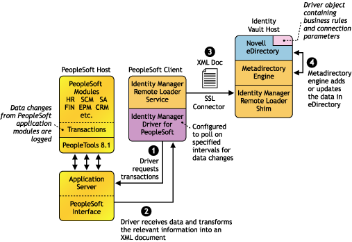 The driver shim (psoftshim.jar) enables communication between PeopleSoft and Identity Vault. It bidirectionally reports object change events and applies object modification commands between these systems.